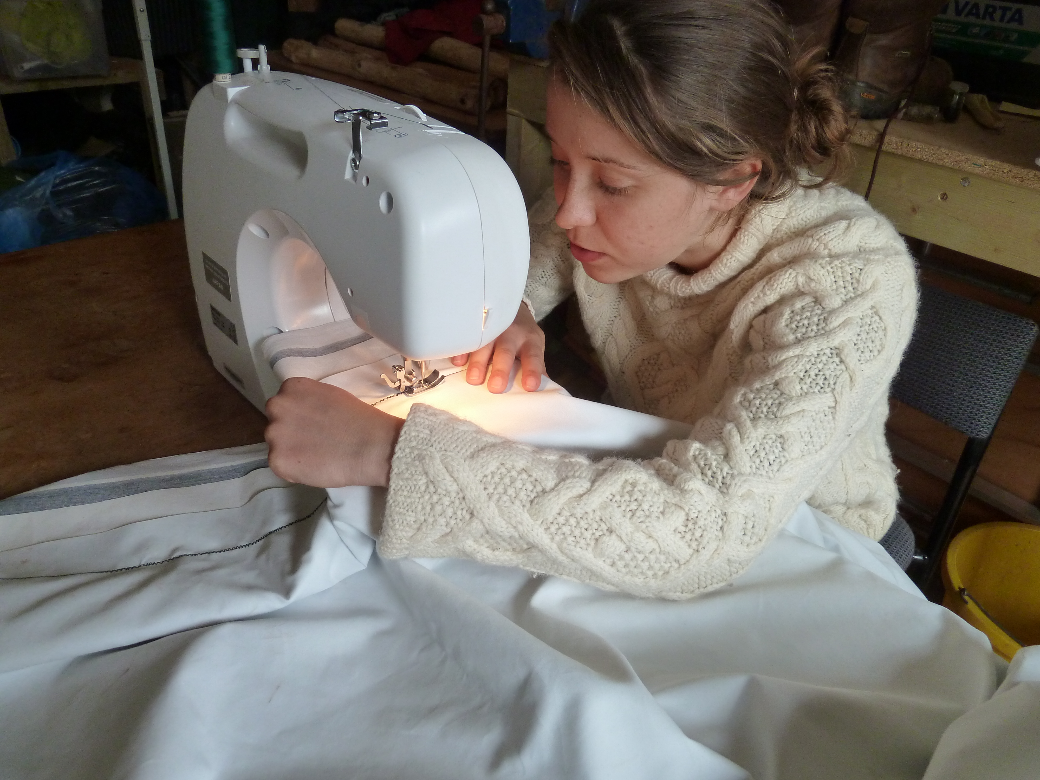 Louise takes over on the sewing machine